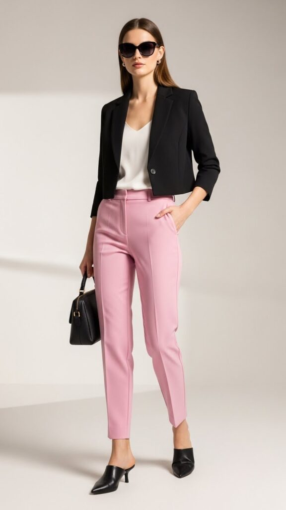 Want to make pink trousers look expensive? Throw a black blazer over literally anything. I’m talking a simple tank top, a graphic tee, or even a plain white cami. The blazer does all the heavy lifting.