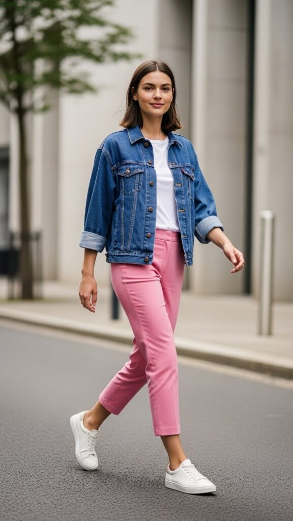Some outfits just work without explanation, and pink trousers with a denim jacket is one of them. It’s casual, it’s cool, and it requires approximately zero brain cells to put together on sleepy mornings.