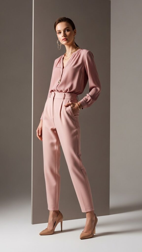 Here’s an underrated styling hack: pair pink trousers with other muted, neutral tones for a sophisticated monochrome effect. Think blush pink pants with a dusty rose sweater or a mauve blazer. It’s tonal dressing, and it looks incredibly expensive.