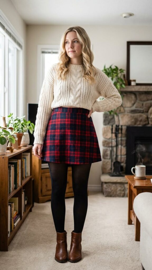 A classic tartan mini skirt paired with a chunky cable knit sweater creates one of winter’s most timeless and flattering combinations. This look gives you the freedom to express your personal style while staying warm during colder months.