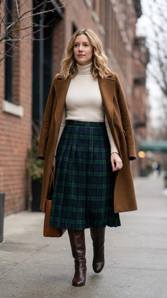 Pair your plaid mini or midi skirt with a fitted Fair Isle sweater in complementary tones. Choose ankle boots with a chunky heel for added warmth and stability on winter streets. This creates a layered silhouette that flatters your figure while keeping you comfortable.