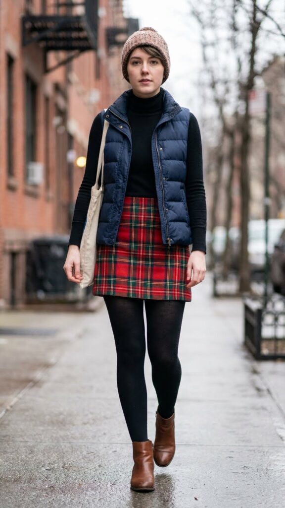 Start with a fitted turtleneck or long-sleeve thermal as your base layer. Add your plaid skirt, then top everything with a quilted puffer vest in a neutral shade like navy, black, or olive. This combination balances warmth with breathability, letting you adjust throughout the day.