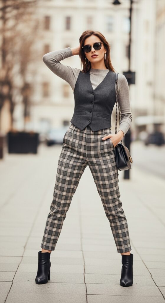 Vests are back in a big way, and honestly, I’m here for it. A fitted vest (sweater vest or tailored vest, both work) over a simple long sleeve top creates layers without bulk. Pair with plaid trousers and ankle boots for a look that’s trendy but totally wearable.