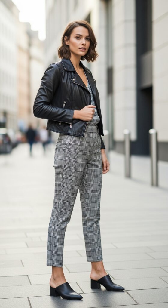 Mixing leather with plaid creates this gorgeous contrast between tough and tailored. A fitted leather jacket over a simple top and plaid trousers works for basically any casual occasion where you want to look effortlessly cool.