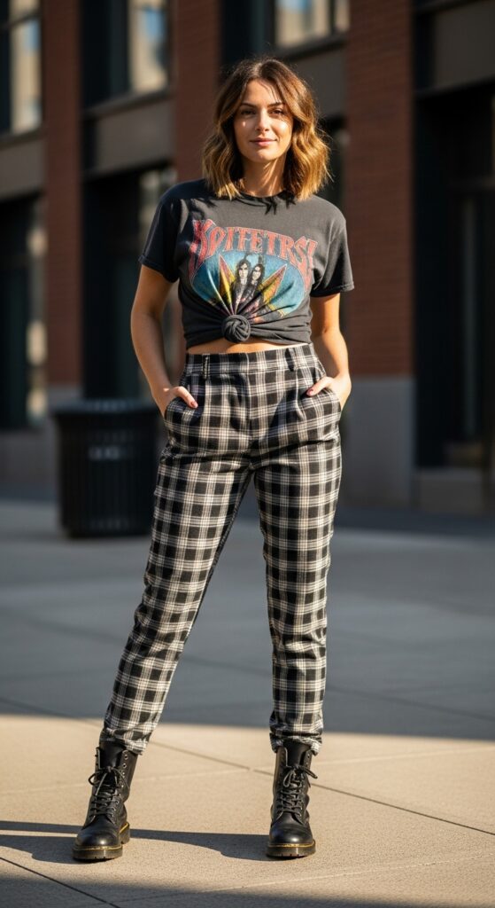 Want to make plaid trousers feel edgier? A vintage band tee or bold graphic shirt instantly takes things in a grungier direction. Tuck it in loosely (the “I did this on purpose” tuck, you know the one) and add combat boots for that street style edge.