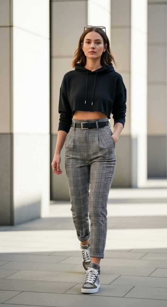 Casual Friday just got an upgrade. A cropped hoodie with plaid trousers is the ultimate “I’m comfortable but make it fashion” outfit. High waisted plaid pants balance the cropped length perfectly, showing just a sliver of skin or layering over a longer tank.