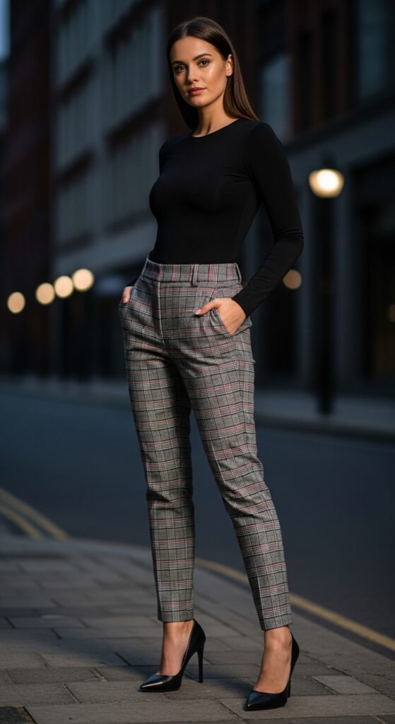 Choose a bodysuit in black, cream, or a rich jewel tone depending on your plaid pattern. The fitted top contrasts beautifully with the structured trousers, and heels add that sophisticated edge.