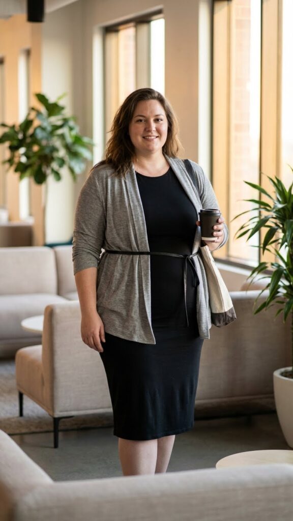Some mornings just scream dress day. A midi dress does all the work while a lightweight cardigan keeps things office friendly. Bonus points if the dress has stretch because comfort is non negotiable.