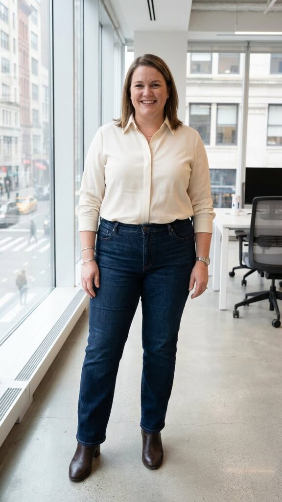 Yes, dark denim can absolutely work in casual offices. A pair of dark wash straight jeans with a structured top feels clean and work ready. Add loafers or ankle boots and you’re set.