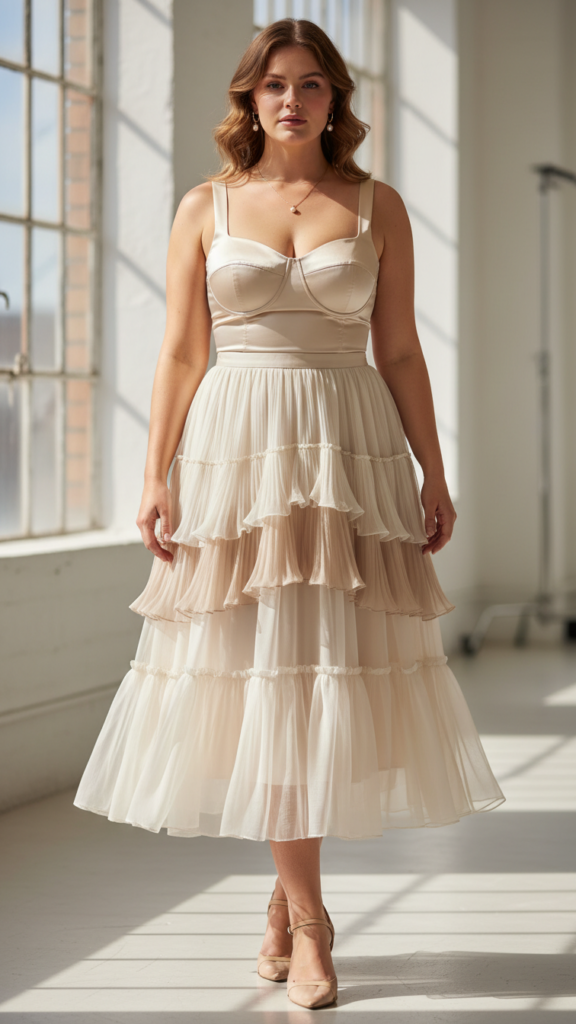 Three key styling advantages make tiered midi skirts with fitted bodice tops an exceptional choice for plus size graduation ceremonies. First, the fitted bodice creates definition at your natural waist while the flowing tiers provide movement and comfort.