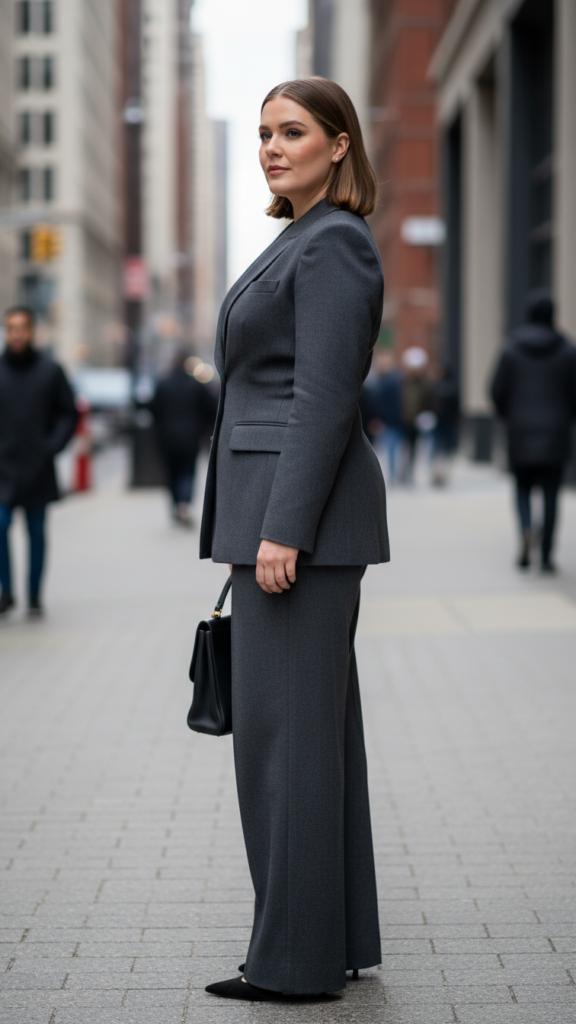 Choose a monochromatic color scheme in navy, charcoal, or deep burgundy to create visual continuity. The structured blazer defines your waist while wide-leg trousers offer comfortable movement and balance proportions beautifully.