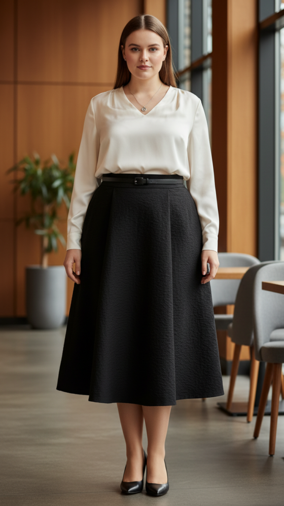 Choose a high-waisted pencil skirt in structured fabric to smooth your midsection and elongate your legs. The peplum top works magic by defining your waist and balancing proportions.
