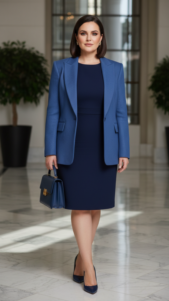 Choose a knee-length shift dress in navy, black, or burgundy as your foundation. Layer a customized blazer with sharp lapels and fitted shoulders to create visual balance. The jacket’s clean lines complement the dress’s relaxed fit beautifully.
