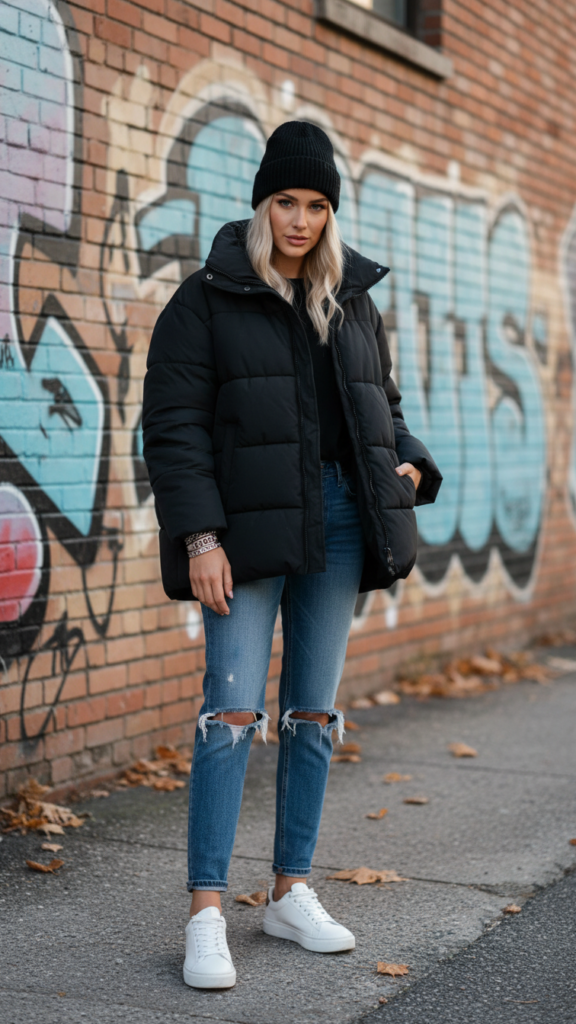 Oversized Puffer Jacket With Ripped Jeans and Fresh Kicks