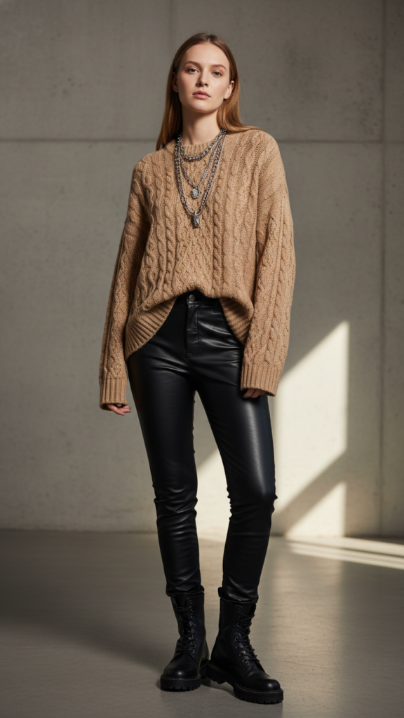 Choose chunky knits in neutral colors like black, gray, or cream to complement sleek leather bottoms. Layer multiple chain necklaces at varying lengths for visual interest, and add a chunky chain bracelet or rings for extra impact.
