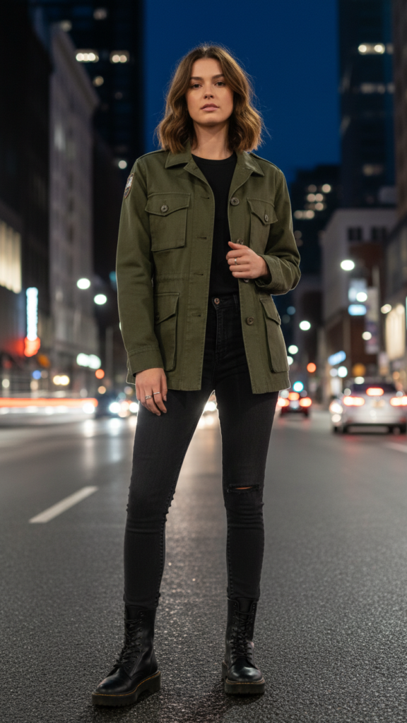 Military-inspired jackets bring structured sophistication to rap concert outfits while maintaining the rebellious spirit that defines the genre. The military silhouette creates sharp, clean lines that complement your body’s natural shape while projecting confidence and authority.