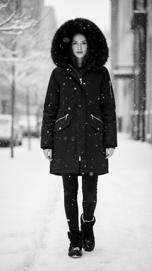Choose parkas with luxurious faux fur accents around the hood for maximum visual impact without compromising your values. A monochrome color palette creates sophisticated coordination between your outerwear and footwear choices.