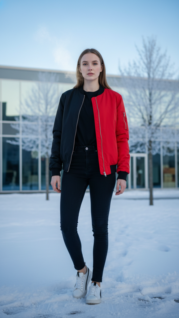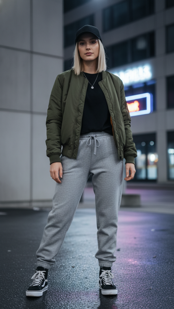 Bomber jackets paired with joggers and high-top sneakers create one of the most comfortable yet stylish combinations for rap concerts. You’ll appreciate how this outfit moves with you during energetic performances while maintaining that street-smart aesthetic artists and fans love.