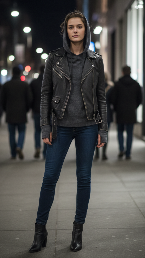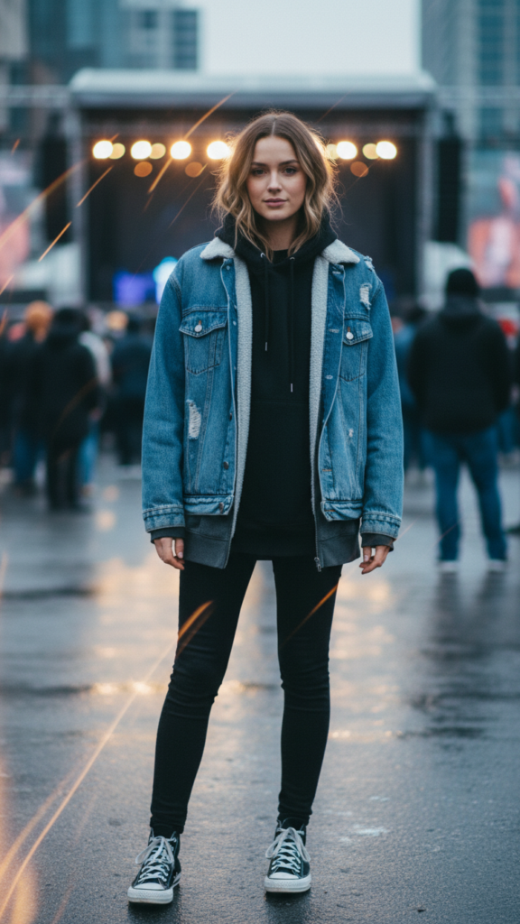 Start with a fitted hoodie as your base layer, then add a slightly oversized hoodie on top. Choose contrasting colors like black under gray or navy under cream. Your denim jacket becomes the outer shell, keeping you cozy yet edgy throughout the show. This edgy layering approach works perfectly for winter concerts where you need both warmth and that authentic rock-inspired vibe.