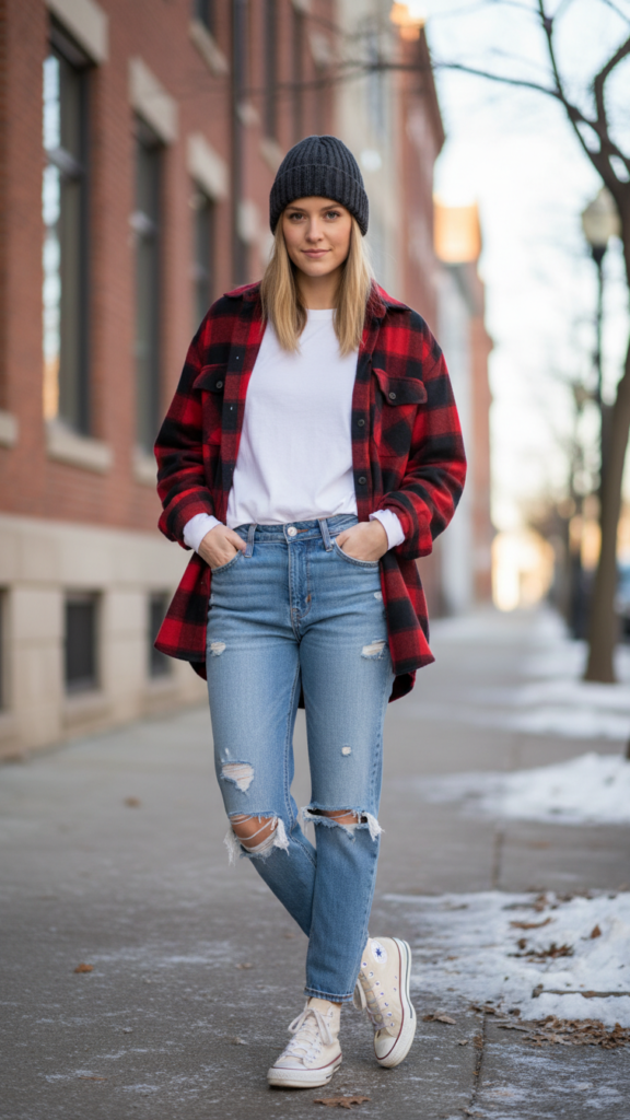 Flannel Shirt Over Long Sleeve Tee With Beanie