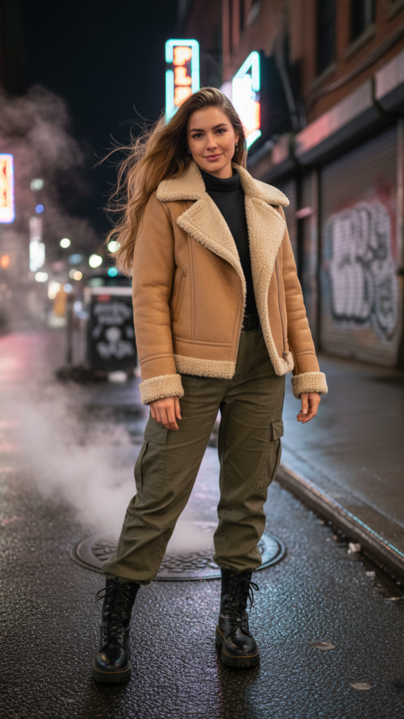Sherpa-Lined Jacket With Cargo Pants and Combat Boots