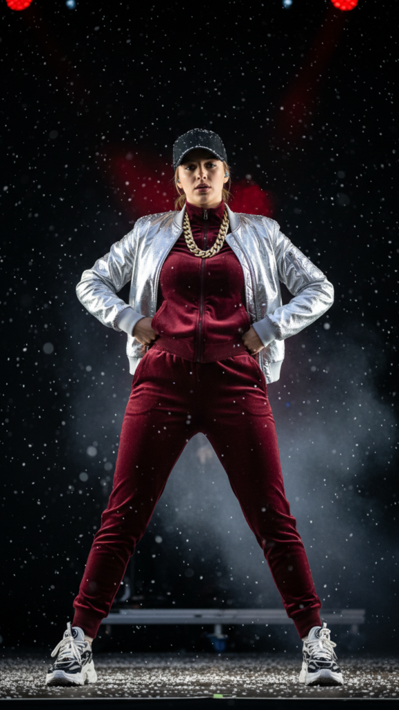 Enhance your concert look by combining a sleek tracksuit with bold statement outerwear that commands attention from every angle. Choose a classic velour tracksuit in rich colors like burgundy or navy for that authentic hip-hop vibe.