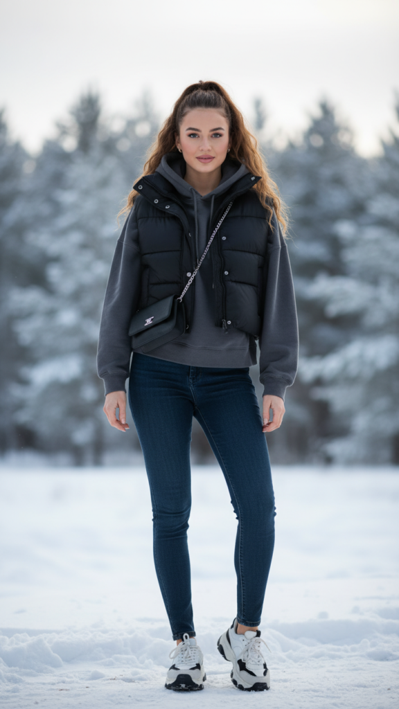 Cropped Puffer Vest Over Hoodie and Skinny Jeans