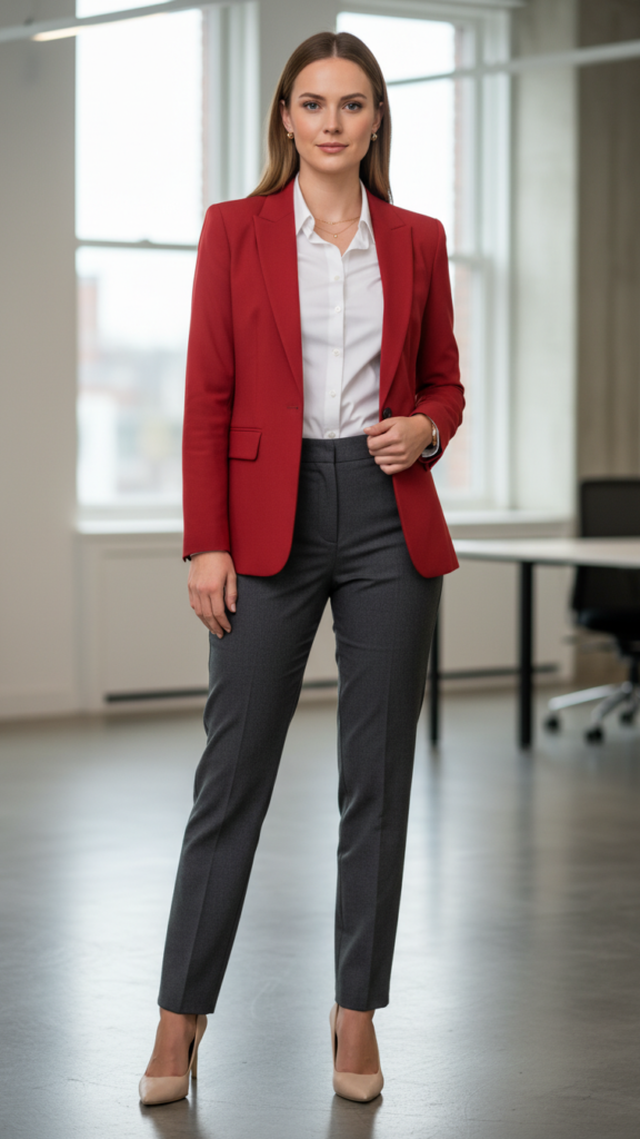 Every professional wardrobe needs that one statement piece that alters ordinary suiting into a powerful ensemble, and a lively red blouse paired with charcoal suiting delivers exactly that impact. You’ll create sophisticated contrast while maintaining workplace appropriateness through this strategic color pairing.