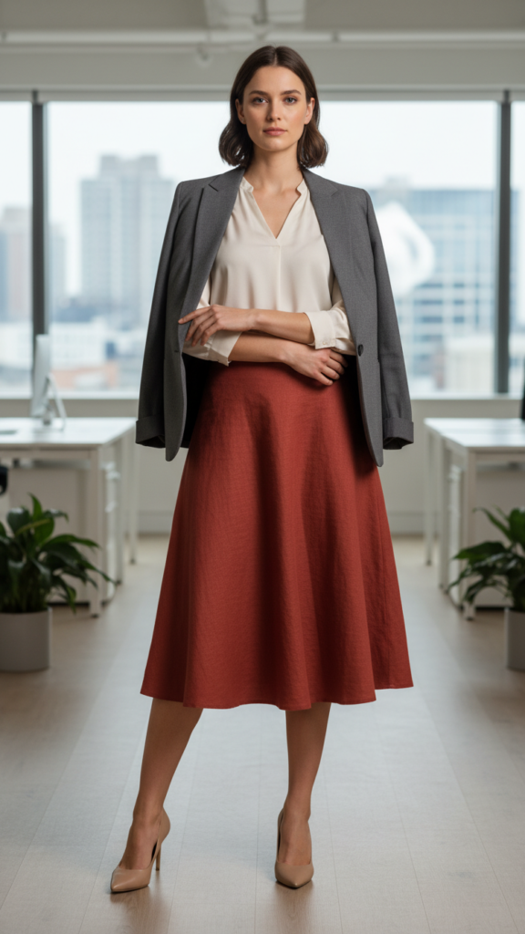 When you’re building a versatile professional wardrobe, brick red midi skirts offer unmatched styling flexibility that adjusts to multiple office scenarios. This rich, muted tone creates a flattering silhouette while remaining sophisticated enough for executive meetings.