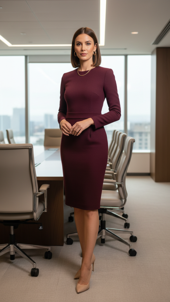 Although power dressing often involves bold colors, a burgundy sheath dress delivers executive sophistication with understated elegance that commands respect in boardrooms and client meetings. You’ll find this classic burgundy color palette offers versatility while maintaining professional authority.