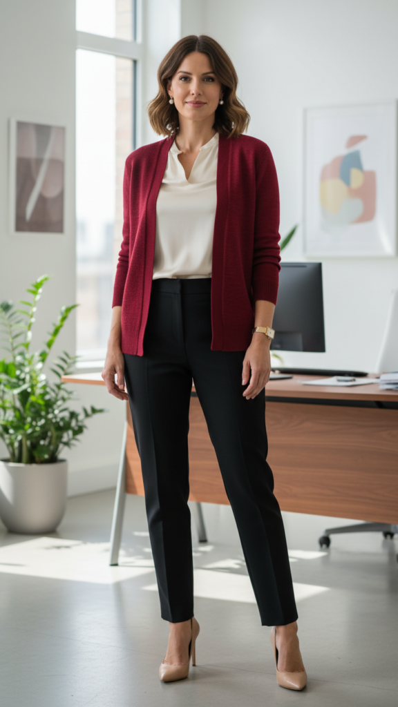 Consider crimson statement earrings, burgundy leather belts, or cherry-colored structured totes as additional options. These accessories let you experiment with bold color while keeping your core wardrobe versatile and professional.