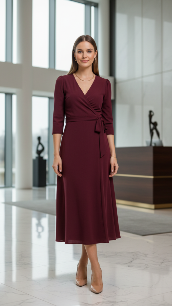 The cinched waistline naturally flatters your figure while maintaining appropriate coverage for conservative workplaces. Choose midi-length styles that hit just below the knee for ideal professional appeal. For an elevated luxurious touch, consider pairing your wrap dress with a silk skirt layered underneath for added texture and movement. Pair your wine wrap dress with nude pumps and minimal gold jewelry to enhance the refined look.