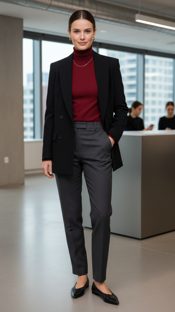 Since deep red turtlenecks offer sophisticated versatility, they’ve become essential pieces for creating polished professional looks that work across seasons. You’ll find these rich burgundy knits work beautifully with custom-made blazers and straight-leg trousers for boardroom meetings.