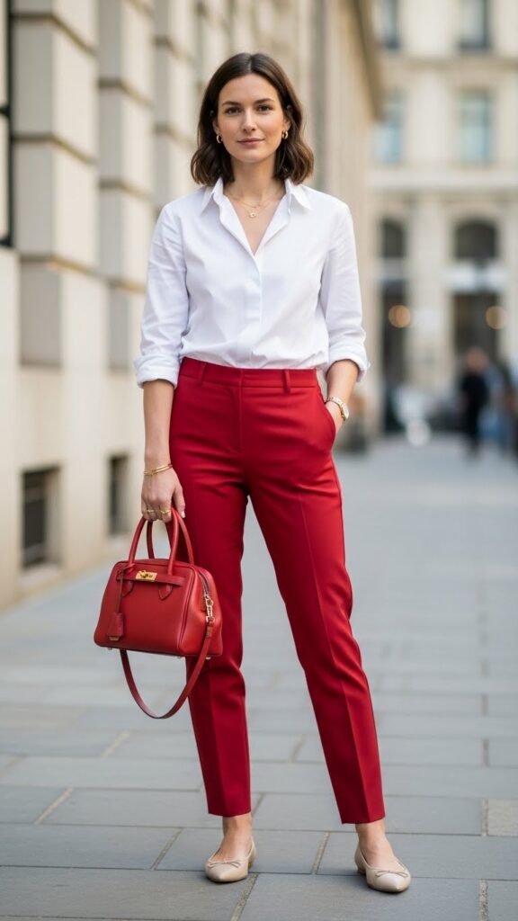 A crisp white button down tucked into your red trousers creates this incredibly polished look that works everywhere. Literally everywhere. Job interview? Check. Fancy lunch? Absolutely. Random Tuesday when you want to feel like a million bucks? Oh yes.