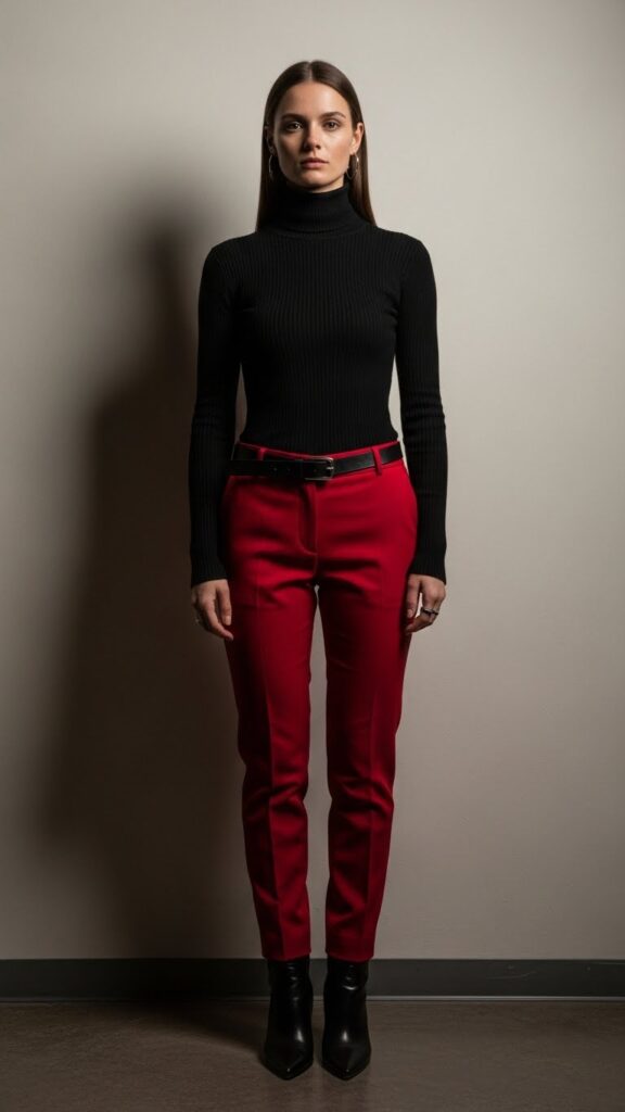 When in doubt, go monochrome on top. A black turtleneck or sleek long sleeve tee with red trousers gives serious editorial energy without trying too hard.