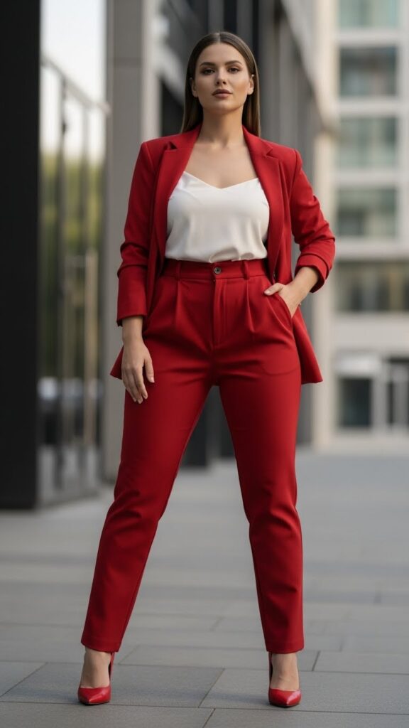 Underneath, keep it simple with a white tee or silk camisole. Some swear by going shirtless under the blazer for maximum drama, but that requires a level of confidence I only possess on very good hair days. Either way, this red trousers outfit idea demands attention. Pointed heels complete the look, but sleek loafers work too if you’re on your feet all day.