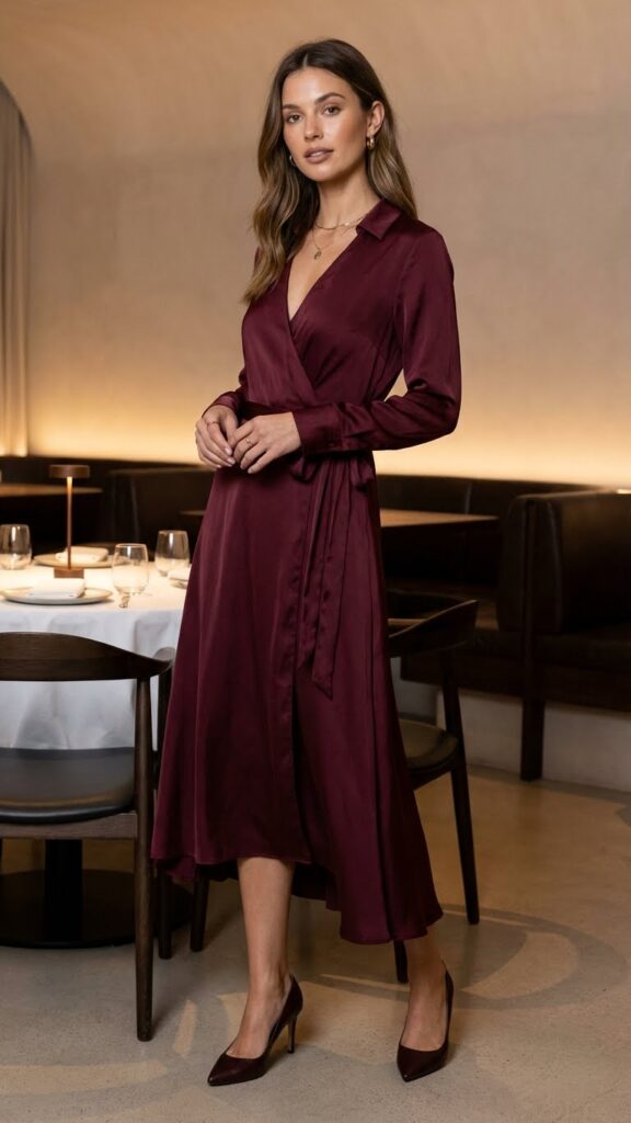 Pro move: Keep accessories simple since the dress is already a statement. Strappy heels, a small evening bag, and understated jewelry let the dress shine. The wrap style also means you can actually eat dinner comfortably (thank you, adjustable tie), which matters more than people admit. Nobody wants to spend the evening sucking in or tugging at their outfit.