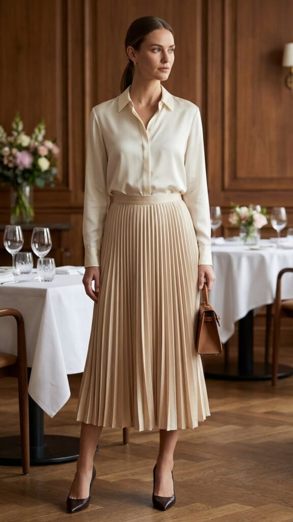This combo feels very “polished dinner party” in the best way. A midi skirt brings elegance and movement, while a silk blouse adds that luxe, refined touch. Together, they create an outfit that’s sophisticated without feeling stuffy.