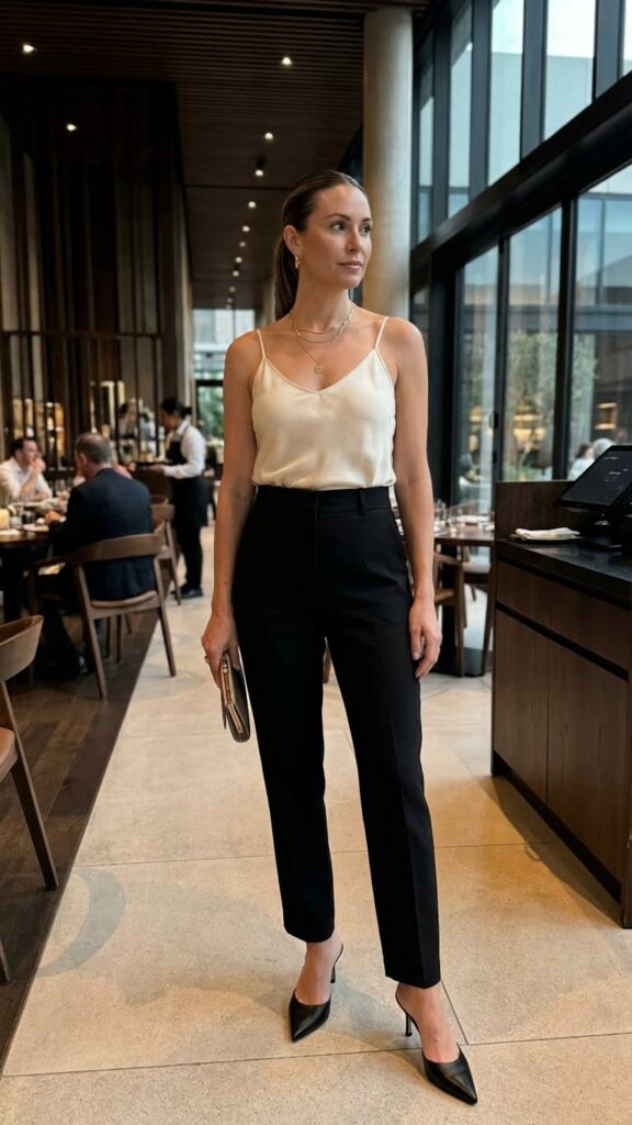 Who says you need a dress? A sleek pair of tailored pants with a beautiful camisole is equally elegant and honestly more versatile. This outfit feels modern, refined, and very “I know what I’m doing.”