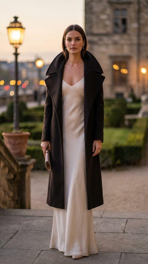 Okay, this one is a vibe. Start with a simple, elegant dress—think slip style, sheath, or A-line in a neutral or jewel tone. Then add the real star: a gorgeous statement coat or longline blazer that transforms the whole look.