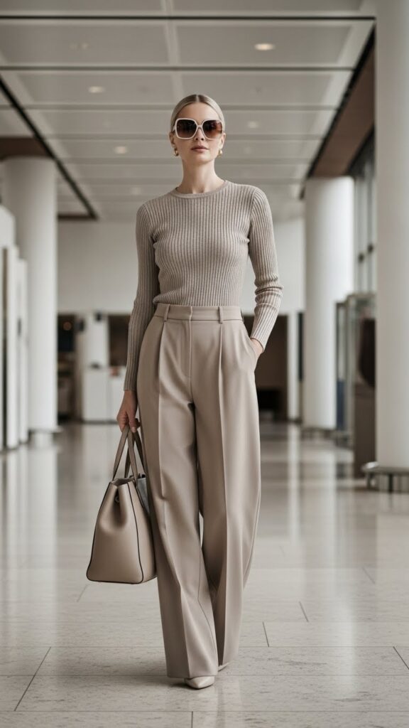 If there’s one outfit that screams “I have my life together,” it’s a matching cashmere set. We’re talking a crewneck sweater paired with matching wide-leg pants or a midi skirt. The beauty here is in the simplicity. No overthinking required, which is exactly what you need at 5 AM when your Uber’s waiting.