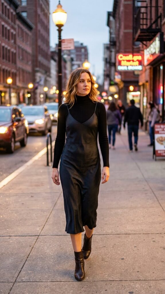 A slip dress on its own can feel too dressed up or too lingerie-adjacent for some dinner spots. But layer a fitted turtleneck underneath and suddenly it transforms into this cool, fashion-forward look that works almost anywhere.
