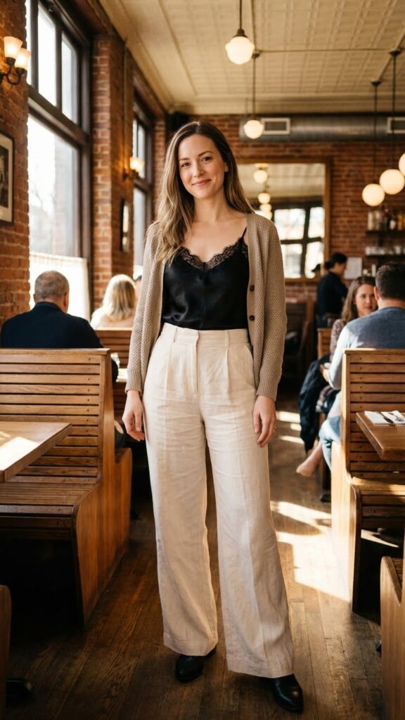 Add bold red lipstick and suddenly that basic work shirt becomes date night appropriate. This is the kind of outfit that proves you don’t need a whole new wardrobe to look incredible. Sometimes the pieces you already have just need a fresh perspective.