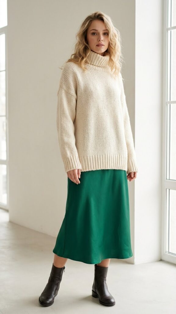 A cozy turtleneck in cream or oatmeal pairs beautifully with jewel-toned satin, like emerald or burgundy. You’ll love how the textures contrast against each other. The chunky knit adds visual weight while the satin flows freely around your legs. White satin skirt can be a particularly elegant choice for a soft, winter look.