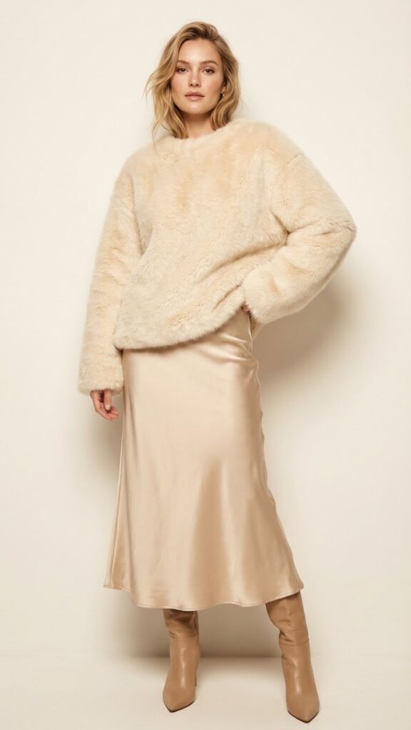 Choose an oversized faux fur pullover in neutral tones like cream, camel, or soft gray. The plush texture beautifully offsets your satin skirt’s sleek sheen. For luxe faux fur accessorization, add a matching faux fur headband or wrist cuffs to complete your look.