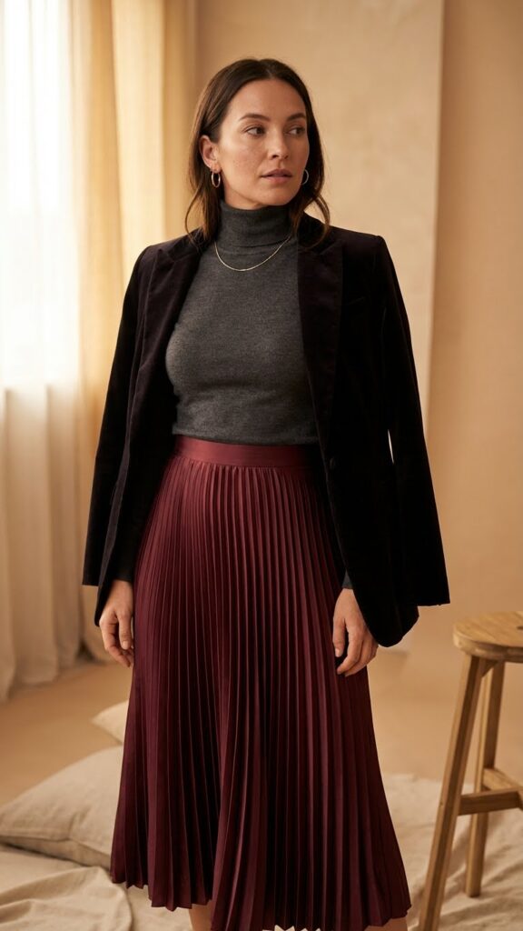 For added polish, try a velvet blazer complementing satin skirt pleats. The texture combination adds visual interest and keeps you warm during colder months. Choose a blazer in burgundy, forest green, or classic black.