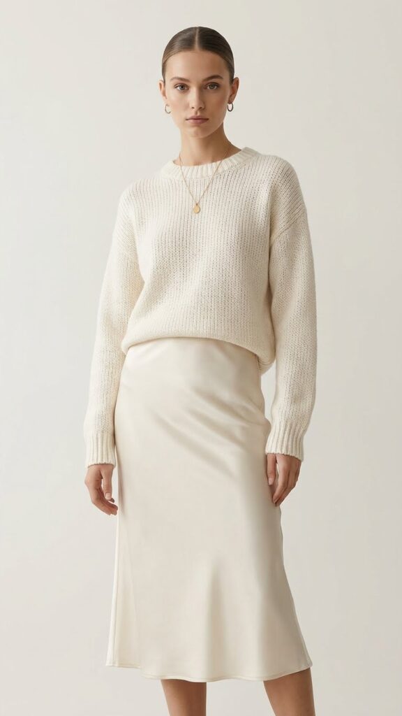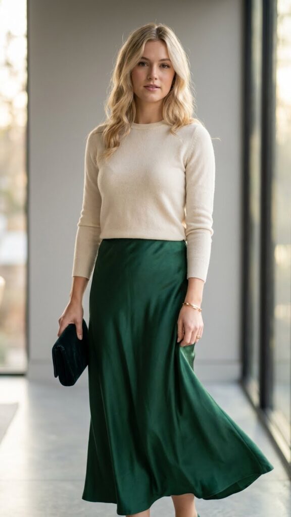 Tone on tone layering works beautifully when you combine textures within the same color family. Pair a cream satin midi skirt with an ivory cable-knit sweater for visual interest without breaking the cohesive palette. Rich jewel tones like emerald or burgundy also create stunning winter combinations.