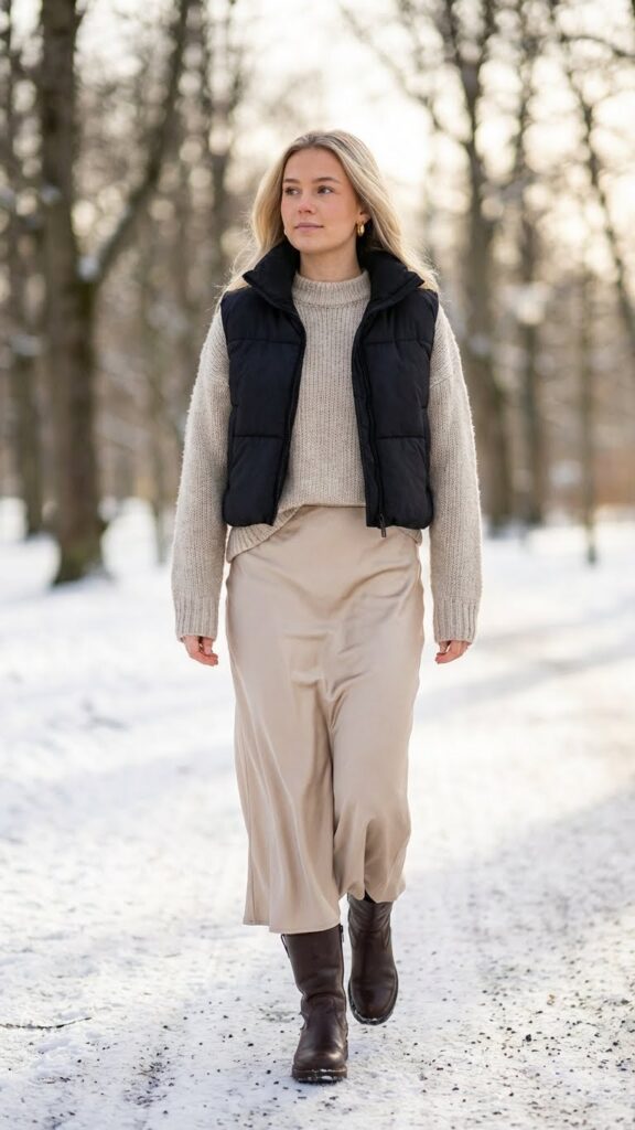 Although puffer vests might seem like casual outerwear, they’re actually a surprisingly chic layering piece for your satin skirt outfits. The contrast between quilted texture and smooth fabric creates visual interest that enhances your entire look.