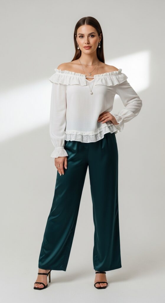 Ready to turn heads? An off-shoulder blouse paired with silk trousers is basically red carpet energy in everyday form. This outfit idea brings drama without being over the top.