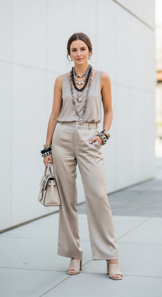 Sometimes less is more, right? A basic tank top tucked into silk trousers creates a clean canvas that lets statement jewelry do all the talking. Think bold earrings, layered necklaces, or chunky bracelets.